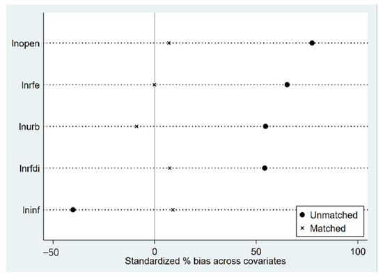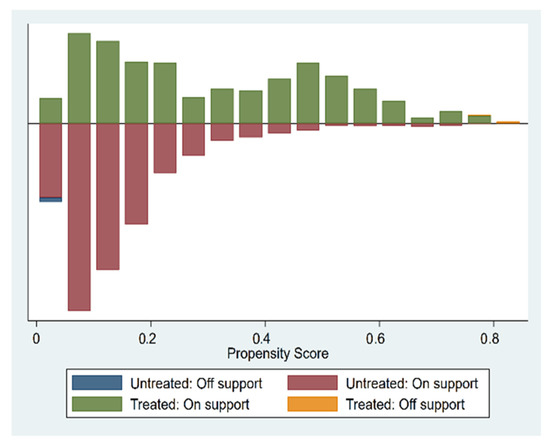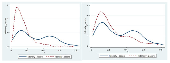 Before propensity score matching, the sample data need to meet the “overlapping assumption”, that is, the propensity scores of the samples of the control group and the experimental group have values in common. As seen from Figure 1, the common value of the experimental group and the control group’s sample propensity scores is significant, and most sample propensity scores are within the common value range. After propensity score matching, Figure 2 showed that the standardization deviation of most variables has been significantly reduced. It is arguably true that the propensity score matching method adopted in this paper has well eliminated the problem of sample selection bias. The density curves of the two groups of urban samples before and after propensity score matching can be seen in Figure 3. Before propensity score matching, there is a large bias in the propensity score density curves between the experimental group and the control group samples. After propensity score matching, the propensity score probability density curves of the two groups are very similar, indicating that propensity score matching eliminates most of the selection bias.