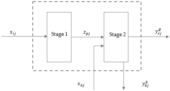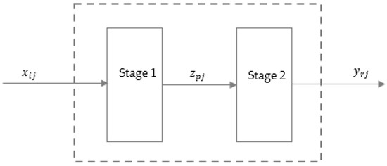 Kao et al. [37,38] proposed that under constant returns to scale, the total system efficiency is equal to the product of subsystem efficiency. That is to say, for (j = 1, 2, …, n), the relationship among the efficiencies is . Since the geometric efficiency decomposition model proposed by Kao et al. [37,38] can only be used under the premise of constant returns to scale, it does not apply to the case of variable returns to scale, so it has certain limitations. In this case, to study the two-stage DEA efficiency decomposition method under the condition of variable returns to scale, Chen et al. proposed an additive efficiency decomposition method, arguing that the total efficiency of the system can be decomposed into the weighted sum of the efficiency of two subsystems [39]. That is: , where represents the weight of subsystem 1, and represents the weight of subsystem 2. Based on the traditional two-stage network DEA model, considering that there may be new inputs and undesired outputs in stage 2, the model in Figure 3 is constructed.