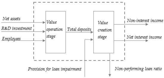 Seiford et al. applied a two-stage DEA to bank performance research that divided the bank production process into two stages for the first time by studying the profitability and marketability of the top 55 commercial banks in the United States. It was found that larger banks performed better in profitability while smaller banks performed better in marketability [9]. Using 35 banks in Taiwan as a sample, Lin et al. applied a two-stage DEA model to measure banks’ service penetrations and profit creation efficiencies. The study showed that banks should focus on a few products rather than diversify too widely [10]. Omrani et al. constructed a two-stage DEA model to divide the bank’s business process into the production and profitability stages and evaluated 45 agricultural bank branches in the West Azerbaijan Province of Iran [11]. Wasiaturrahma et al. developed the two-stage DEA method to study the efficient performance of Indonesia’s traditional banks and Islamic rural banks and concluded that the People’s Credit Bank and Islamic People’s Financing Bank were inefficient in the intermediary role but highly efficient in production [12]. Milenkovic et al. used an output-oriented two-stage DEA method to determine the efficiency of the intermediary functions of banks in the Western Balkans for the period 2015–2019 [13]. H. Li et al. applied the two-stage network DEA model to bank performance evaluation and sustainable product design [14]. Li et al. proposed that the business process of commercial banks should be divided into the fund-raising and profit-making stages to obtain the efficiency evaluation of two stages applied to the efficiency evaluation of 32 listed commercial banks in Shanghai and Shenzhen [15]. Wu et al. proposed the two-stage network DEA method to evaluate the overall efficiency, fund-raising efficiency, and fund-using efficiency of 27 Chinese commercial banks from 2006 to 2020. They put forward several policy implications based on the findings [16]. Kumar developed a two-stage network DEA model to compare India’s private-sector and public-sector banks, finding that the former was more efficient than the latter in the profitability efficiency stage [17]. Scholars, as mentioned earlier, have considered the stage characteristics of the bank’s operation process. Nevertheless, the default output of the bank was the desired output, thus ignoring the impact of the undesirable output on the bank’s operating efficiency.