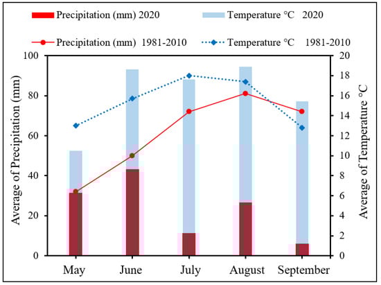 The annual average precipitation during the period of 1982–2010 ranged from 32 to 81 mm, with a high average in August, and an annual average temperature of 15.38 °C. The area has a medium temperate climate with an average temperature of 16.23 °C during the maize-growing season in 2020, with the high-temperature values recorded in June and August being an average of 18.63 and 18.87 °C, respectively. The annual precipitation was 23.62 mm in 2020, which is less than the long-term average (Figure 1).