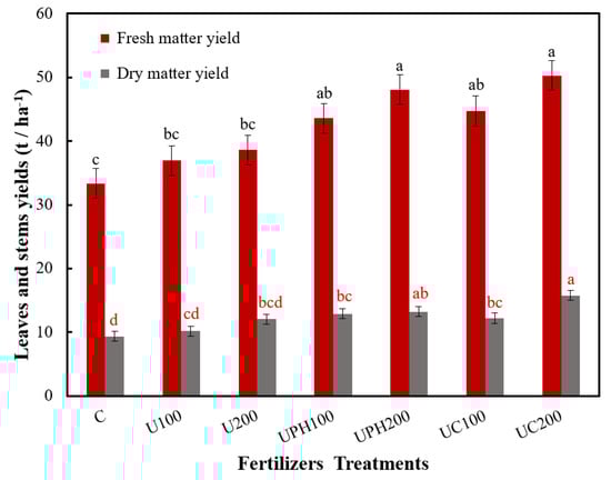 Fresh leaves and stems and dry matter yields followed by Duncan’s multiple range test letters at 5% level. The letters with the same color have the same significance level test. Note. Control (C) = non-treated, U100 = 100 kg N ha−1 urea, U200 = 200 kg N ha−1 urea, UPH100 = 100 kg N ha−1 urea + potassium humate (UPH), UPH200 = 200 kg N ha−1 urea + potassium humate (UPH), UC100 = 100 kg N ha−1 urea cocrystal (4urea.CaSO4), and UC200 = 200 kg N ha−1, urea cocrystal (4urea.CaSO4).