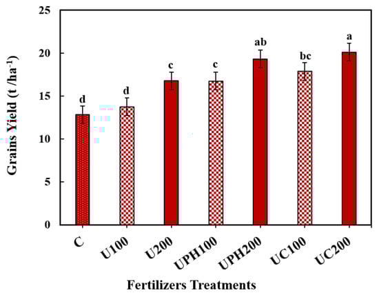 The mean grain yields followed by Duncan’s test letters are shown in Figure 3. There were highly significant differences between the effects of the treatments on grain yields. The mean grain yields ranged from 12.84 t/ha−1 in the control to 20.11 t/ha−1 in UC200, as shown in Table 3. The urea treatments (U100, U200) increased grain yields by 7.16% and 30.53%, respectively, compared to the control (C), while the urea + potassium humate (UPH100, UPH200) and urea cocrystal treatments (UC100, UC200) provided a 30.51, 50.47, 39.23, and 56.63% increase in grain yields, respectively, compared to the control. Additionally, the treatments had significant effects on both the fresh and dry cob yields. The mean fresh cob yields ranged from 26.11 t/ha−1 in the control to 36.95 t/ha−1 in UC200, and the mean dry cob yields ranged from 18.69 t/ha−1 in the control to 25.88 t/ha−1 in UC200 (Table 3). Compared to the control, the modified urea treatments recorded the highest grain and cob yields, as well as fresh and dry matter yields (UC200 > UPH200 > UC100).