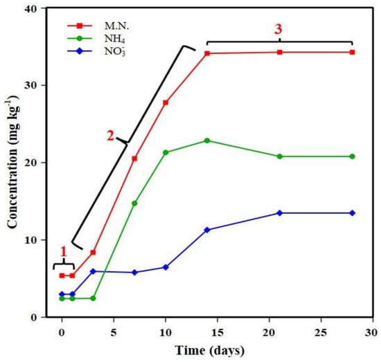 Some pre-studies examined the release process of mineral nitrogen and its forms (NO3− and NH4+) from urea compound granules in the soil without plants (Figure 4). The process was divided into three stages including (1) low concentration, (2) increased concentration and (3) stability of concentration. Additionally, the results showed that the concentration of ammonium, nitrate, and mineral nitrogen increased with time due to the decomposition of urea compound granules. The relation between the transformation of soil mineral nitrogen forms depended on soil water content and urea compound type. The mineral nitrogen concentration started with a low concentration in the beginning until three days, then increased to a maximum over two weeks. After that, the nitrogen concentration remained somewhat stable or decreased depending on the microbial activity or ammonia volatilization.