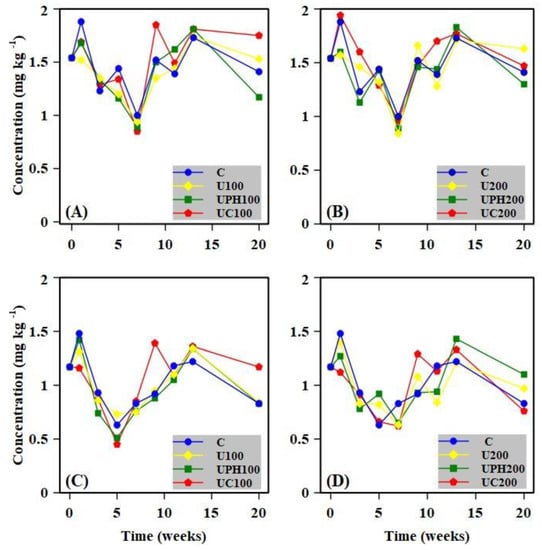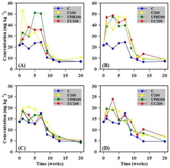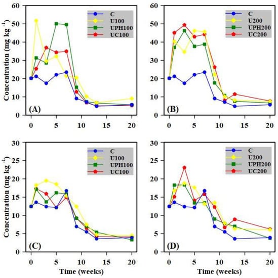 The relation between the mineral nitrogen concentration and time during the maize growth period in soil surface 0–30 cm (A,B) and subsurface 30–60 cm (C,D). Note. Control (C) = non-treated, U100 = 100 kg N ha−1 urea, U200 = 200 kg N ha−1 urea, UPH100 = 100 kg N ha−1 urea + potassium humate (UPH), UPH200 = 200 kg N ha−1 urea + potassium humate (UPH), UC100 = 100 kg N ha−1 urea cocrystal (4urea.CaSO4), and UC200 = 200 kg N ha−1, urea cocrystal (4urea.CaSO4).
