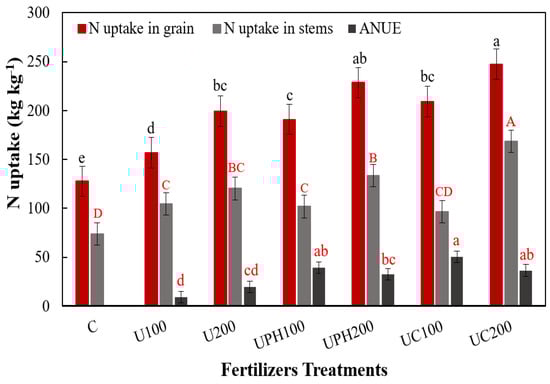 The effect of urea compound treatments on N uptake (kg kg−1) in maize grains and stems, and ANUE (kg kg−1) followed by Duncan’s multiple range test letters at 5% level. The letters with the same color have the same significance level test. Note. Control (C) = non-treated, U100 = 100 kg N ha−1 urea, U200 = 200 kg N ha−1 urea, UPH100 = 100 kg N ha−1 urea + potassium humate (UPH), UPH200 = 200 kg N ha−1 urea + potassium humate (UPH), UC100 = 100 kg N ha−1 urea cocrystal (4urea.CaSO4), and UC200 = 200 kg N ha−1, urea cocrystal (4urea.CaSO4).