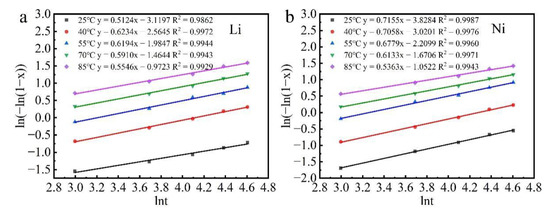 As can be seen from the Figure 4, the fitting coefficients of the four metal elements at different temperatures were all greater than 0.98, indicating that the Avrami equation model can well reflect the whole leaching process. It is generally believed that when the parameter in Avrami model is greater than 0.5, leaching is controlled by surface chemical reaction. When is less than 0.5, leaching is controlled by diffusion [37]. The values of the four metals at different temperatures were all greater than 0.5, and it was preliminarily concluded that the surface chemical reaction was the control of the four metals’ leaching process. The values of the fitted curves of Li, Ni, Co, and Mn all increased with the increase in temperature, indicating that temperature could significantly change the rate of leaching reaction.