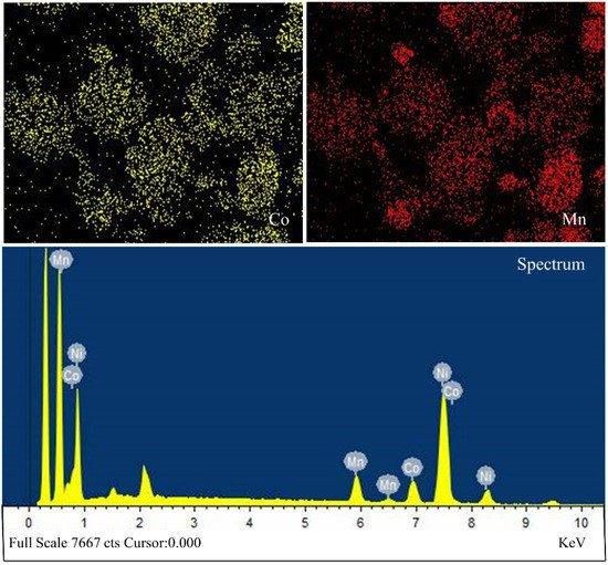 For purpose of studying the microstructure and chemical composition of spent ternary lithium-ion battery cathode powder before and after leaching, SEM-EDS was used to characterize and analyze it. As shown in Figure 7a, the appearance of the particles before leaching is spherical with different particle sizes, and Ni, Co, and Mn are uniformly distributed in the spherical particles. Because the energy of Li produced by the X-ray strafing is small, so Li cannot be detected and analyzed. On account of the corrosion behavior of the leaching agent, Figure 7b shows that the particles after leaching are completely irregular and spongy. This indicates that the leaching of cathode powder is an irregular corrosion reduction process rather than a uniform shrinking process, which again proves that the leaching process is inconsistent with the assumption of the unreacted shrinking core model. After the leaching process, three metal elements disappear in vast numbers, and the remaining valuable metals are unevenly dispersed in the residue. The content of nickel, cobalt, and manganese can be calculated from the intensity of the peaks and the response value of this element according to the spectrum of mapping. The peaks at 0–2 Kev, show an obvious decrease after leaching, along with peaks at 6–9 Kev disappeared at the same response value. Therefore, the content of nickel, cobalt, and manganese in the residue is lower. This is consistent with the above experimental results and XRD analysis results. However, the specific content of the valuable metal is subject to ICP-OES results.