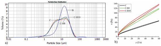 (a) The particle size distribution of blueberry juice encapsulated in whey (B), white chocolate (C), and chocolates with 8% and 10% of B (C-B8 and C-B10); (b) flow curves of chocolates.