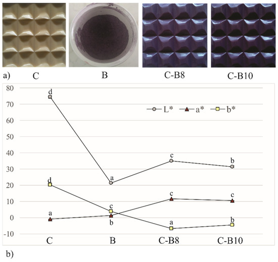 (a) The photograph and (b) color of white chocolate (C), blueberry encapsulates (B) and enriched chocolates C-B8 and C-B10. Values represent average of triplicates ± SD. Means with different letters (a, b, c, and d) for each parameter are significantly different (p < 0.05).