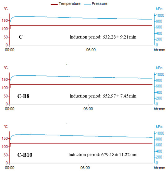 The chocolate samples were analyzed for oxidation stability using RapidOxy 100 (Anton Paar, Blankenfelde-Mahlow, Germany). First, 3 g of finely chopped chocolate sample were placed in a glass dish and placed in the sealed instrument chamber. The samples were tested with a user-defined program at a test temperature of 120 °C and 700 kPa filling pressure until a pressure drop of 10% below maximum pressure (pmax) was detected. The induction period represents the time in minutes elapsed between the start of the test when oxygen pressure is stabilized at 700 kPa to the pressure drop of 10% from the recorded maximum pressure at 120 °C [35].