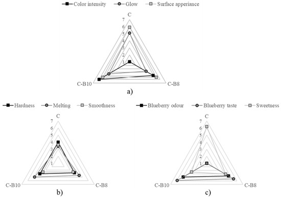 The influence of blueberry juice encapsulated in whey on the sensory characteristics of fortified white chocolates C-B8 and C-B10 is presented in Figure 4.