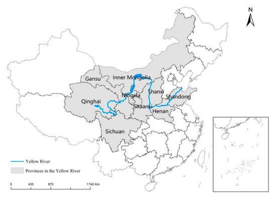 The Yellow River is the second longest river in China, with a total length of about 5464 km, originating from the Tibetan Plateau and flowing from west to east through nine provinces and regions, including: Qinghai, Sichuan, Gansu, Ningxia, Inner Mongolia, Shanxi, Shaanxi, Henan and Shandong, before finally flowing into the Bohai Sea, with a basin area of 752,000 square kilometres (Figure 1). This paper uses the nine provinces and regions of YRB as the research object to conduct a study on measuring the level of HQD in the basin and to reveal the characteristics of the spatial and temporal patterns of the HQD level in the nine provinces and regions of the basin.