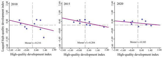 This paper uses Geoda to measure the global Moran’s I for YRB for the years 2010, 2015 and 2020. The global Moran’s I [43] measures the structural pattern and agglomeration (dispersion) of HQD in the YRB as a whole. The Moran’s I takes values between −1 and 1. If I > 0, it means that the level of HQD in the basin is positively correlated in space, i.e., HQD tends to be spatially aggregated and there is spatial spillover effect, while I < 0 means that the level of HQD is negatively correlated, i.e., HQD tends to be spatially dispersed. The results show that the global Moran’s I for 2010, 2015 and 2020 are −0.216, −0.204 and −0.103, respectively (Figure 2), indicating that there is a negative correlation between the level of HQD in neighbouring provinces in the YRB, i.e., the level of HQD tends to be spatially disperse. This differs from the positive correlation between the green development of the provinces in the Yangtze River Economic Belt as suggested by Cai Shaohong et al. [44] The negative correlation between the levels of HQD in neighbouring provinces in the YRB also indicates that there is no obvious spatial spillover effect of HQD between different provinces, i.e., the radiative diffusion effect of provinces with higher levels of HQD is missing.