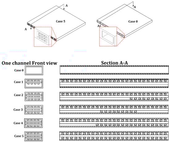 A schematic graph to identify the investigated channel geometry cases. A cross-sectional view of the channel in the middle of the coolant domain for Cases 0 through 5.