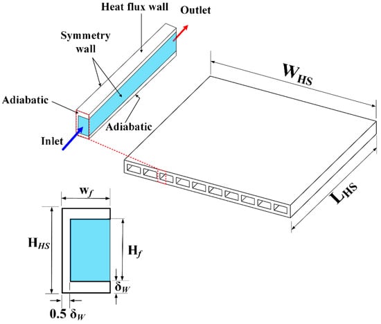 - The gravity influence is neglected. This assumption is valid for small spaces and tight streams, as confirmed by Dang et al. [32]. As the height of the current cooling (HHS) channel is only 1 mm, and the calculations are conducted under single-phase and incompressible flow circumstances, the consequence of gravity is ignored in the current simulation. Furthermore, forced convection is assumed to be dominant, with no local density differences.