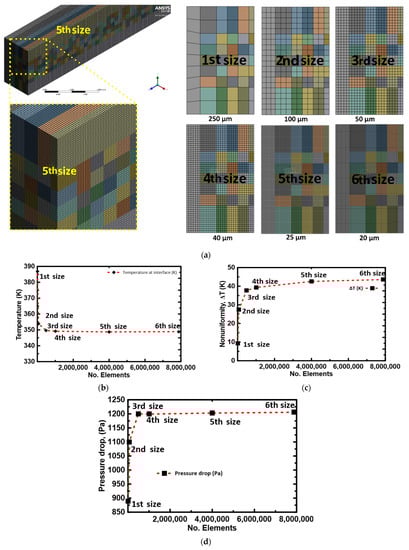 A structured mesh was generated using ANSYS Meshing. Figure 4a presents a sample of the structured mesh at different locations. A mesh-independence investigation was carried out before the model was used to study each design case. The grid sensitivity test was performed concerning the average interface temperature, temperature nonuniformity, and pressure drop. A Reynolds number of 2000, an ambient temperature of 293 K, and a heat flux of 100 W/cm2 were selected as simulation conditions for the mesh sensitivity study. Different computational structured grid sizes were studied. All the studied grid sizes were physically controlled hexahedral configurations. The coarsest studied element size mesh was 250 μm, and the smallest mesh size was 20 μm. The coarse and extra fine mesh sizes element numbers were between 6000 and 8,000,000 elements, respectively. Figure 4b–d present the effect of changing mech size on the average wall temperature, the nonuniformity, and the pressure drop respectively. The percentage error between each consecutive mesh size was calculated to seek a < 1% error value. Therefore, a mesh of four million elements was chosen to reduce computation time while maintaining acceptable accuracy.