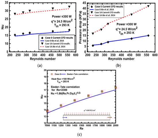 Comparing the current CFD data and Xie et al. [33] findings under identical conditions for (a) Nu and (b) pressure drop, respectively; and (c) Verifications Nu of Case 0 with Sieder–Tate correlation [29].