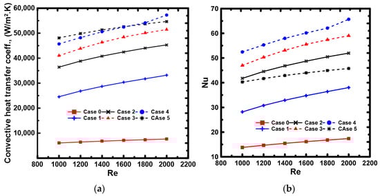 Numerical studies of the heat transfer performance were carried out for all the considered cases with various metal mesh insert locations and lengths. The inlet Re was specified in the range of 1000 to 2000, and the corresponding ranges of the volumetric flow rate and inlet velocity were calculated. The convective heat transfer coefficient was evaluated in each case (Case 1 to Case 5) and compared with the reference case (Case 0). Figure 6 introduces the heat transfer coefficient and Nu change with the inlet Re for all investigated cases. Over the Re range, the heat transfer performance of Case 0 (a cooling channel without any metal insert) showed the lowest heat transfer performance.
