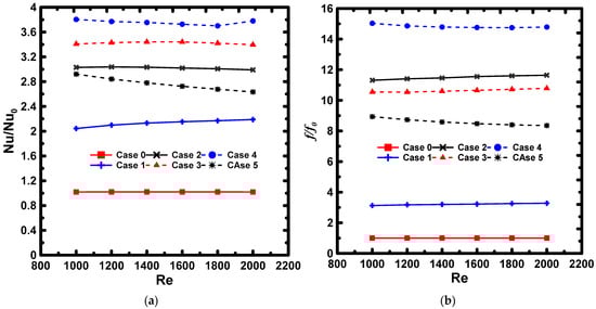 Figure 8 shows the variations of the Nusselt number ratio (Nu/Nu0) and the fanning friction factor ratio (f/f0) with Re, where the denominators present the values for Case 0. From Figure 8a, increasing Re had no significant effect on the Nu/Nu0, or the f/f0 values within the studied range. Case 1 exhibited the lowest Nu/Nu0 and f/f0 values, whereas Case 4 attained the highest values of about Nu/Nu0 = 5, and f/f0 of about 15.
