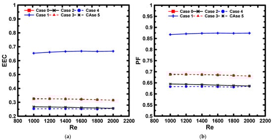 Variations of the efficiency: (a) evaluation criterion EEC; and (b) performance factor (PF) with Re.