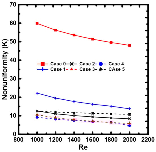 The nonuniformity degree within the heat source for all the proposed configurations was compared with the base case to determine the impact of the metal inserts on the wall temperature uniformity at all Re ranges and the same operating conditions. It was observed that the temperature variation was decreased for all cases with the increase in Re, thereby enhancing the temperature distribution uniformity. It is also clear from the figure that the introduction of the metal inserts considerably enhanced the wall temperature uniformity and reduced the temperature gradient with the length of the device. Cases 3 and 4 showed the lowest nonuniformity levels over the Re range. For Cases 3 and 4, the average uniformity enhancement compared to Case 0 was about 85.4% and 86.6%, respectively. For instance, when Re = 2000, nonuniformity in Case 0 was 48 K, whereas it was 5.84 K and 4.7 K in Cases 3 and 4, respectively. For Cases 1, 2, and 5, the average enhancement of wall temperature uniformity was 67.1%, 82%, and 78.3%, respectively. The metal inserts improved the heat transfer generally and deduced flow and heat maldistribution, which can be interpreted as the metal inserts regenerating the boundary conditions, which kept the heat transfer capability of the working fluid along the flow stream (Figure 10).