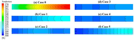 Figure 11 shows the temperature contours of the heat source when the structured metal inserts are involved under the same heat flux of 100 W/cm2 and Re = 2000. All the subfigures used different legends scales due to the significant difference in the obtained results. The figure shows the typical wall temperature distribution contours, which match the literature [33,35,36]. The contours show that the metal inserts considerably reduced the average wall temperature and nonuniformity. It is evident that the metal inserts’ length and petition control the flow field and hotspot location. For more details, Cases 1 and 5 are comparable with Case 0 as the metal inserts were placed along the flow stream. However, in Case 5, the cooling channel is wholly packed with metal inserts, which is not the case in Case 1, where the metal inserts were placed in the top half of the channel. The difference between the two designs (Cases 1 and 5) is reflected in the pressure drop value, nonuniformity (even though the contours distribution is almost the same), and average wall temperature. For Case 2, the metal inserts had a negative effect where the hot spot occurred near the heat source center, a critical position in which any hotspots must be avoided. In the last two, Cases 3 and 4, the lowest nonuniformity levels were achieved, as depicted in the figure. However, Case 4 is preferable as the metal inserts were packed after 1/3 of the channel length from the inlet. In the regions near the inlet, the cooling fluid temperature is typically low, so boundary regeneration is not as important.