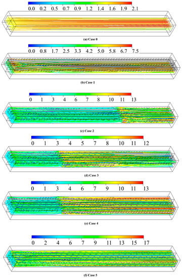 For more clarification, the streamlines of each case at Re = 2000 are shown in Figure 12. An automatically generated legend is used to show areas of high and low-velocity values. The enhancement in the average wall temperature, uniformity, and Nu mentioned earlier can be justified more with the flowing velocity streamlines. It can be noted that the flow inside the flow channel was distributed differently due to the packing of the metal inserts. Hence, higher interaction between the solid surface and the incoming flow. The effect of distributed flow channels generated by the metal inserts is reflected in the enhancement of heat transfer and heat dissipation. As shown in Figure 12a for Case 0, the large flow channels show low resistance to the incoming flow, simplifying its stream along the channel without any distributed manner.in contrast, in Cases 1 to 5, the complex micro inserts’ inner structure forces the flow to change trajectory as it flows past the flow channel, inducing vortices that enhance turbulence and heat transfer.