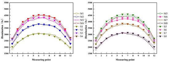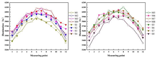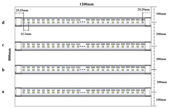 The illuminance measurements were made with DELI illuminance meter DL333204 (Ningbo Deli Tools Co., Ltd., Ningbo, China). In the plane parallel to the irradiation surface at a distance of 37 cm apart, the 1200 × 800 mm plane of the container is divided into 96 small areas of 10 × 10 cm2 (8 rows of 12 columns) and the center illuminance of each small area is used as the illuminance value of the area.