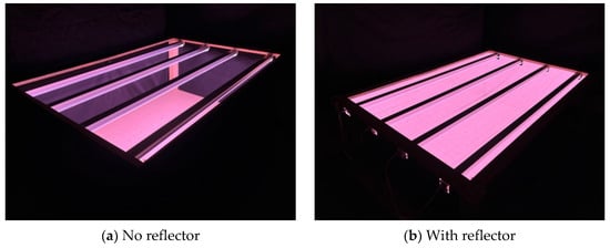 To ensure the reliability of the optical simulation used to design the lighting solution for the growing container, a small optical container platform with dimensions of 1200 mm × 800 mm × 40 mm was built, and its frame was built of wooden boards. According to a preliminary assessment, four T8LED full-spectrum plant growth lights would be required inside the standard layer of the growing container as shown in Figure 1. To improve indoor illumination and lighting, some uniform reflective devices were added to the container. To verify the effects of the reflectors, the container was divided into two compartments: The first has a black light-absorbing cloth on the four inner sides of the container, corresponding to the case without reflection on the sides; the second compartment has reflective aluminum MIRO4 (ALANOD, Ennepetal, Germany) sheets on the four inner sides corresponding to the cases with reflection. In order to reduce the interference of external light, the container was put in a dark room for testing as shown in Figure 2.