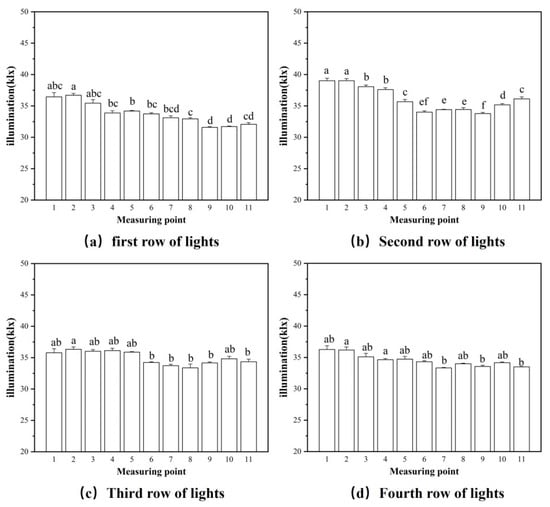 In the experiment, differences were found in the illumination level of different lamp beads in the strip. To detect the errors, the 1200 mm area of the container directly under the LED was divided into 11 measurement points and the illuminance was measured close to the lamp shade. Data were analyzed using SPSS 24. Differences between measurement points were analyzed using analysis of variance (ANOVA). Mean values followed by the same letter are not significantly different as determined by ANOVA and the differences were compared by Duncan’s T3 test and LSD test to a significance level of 5%.