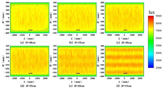 The next full simulation results of illuminance conditions in the container are presented. Different heights corresponding to different growth stages of plants were set to correspond to the dynamic growth of plants. Crops grown in containers were required to have a shorter growing cycle, which means a faster growth rate, for lettuce, kale, and amaranth. Short-growth cycle crops were considered as they are more suitable for growing in containers requiring a light intensity of 200–600 μmol m−2s−1 (2307–6920 lx). Considering that an irradiation height that is too low can cause low uniformity of the irradiated surface [], an irradiation height H ⊆ 15–40 cm was used, with a plant height h ⊆ 0–25 cm. Figure 7 shows a light intensity of 600 μmol m−2s−1 was reached in the middle area inside the 6920 lx contour, meeting the standard illumination requirements of common short-growth cycle crops.
