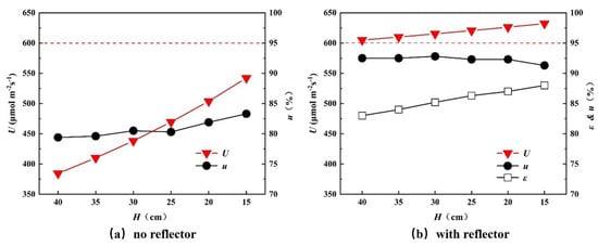 Comparing the two cases, when H = 40 cm, U in the reflector-added case was 57.4% higher than that of the non-reflector-added case, and the u of the reflector case was 13.1% higher than in the non-reflector case. For H = 15 cm, U was 16.6% higher, and u was 8% higher, respectively. It shows that although the effect of the reflector decreases with the distance, it can improve the light intensity and uniformity.