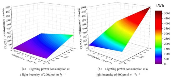 According to (1), the daily power consumption of container lighting under different light intensities (T ⊆ 8–16 h·d−1) is 9.7–19.5 kWh for a light intensity of 200 μmol m−2s−1 and 29.1–58.2 kWh for a light intensity of 600 μmol m−2s−1. According to the photoperiod and growth days of typical short-growth cycles, the power consumption at the corresponding light intensities is shown in Figure 9, where the x-axis coordinate is the number of growth days (20 < x < 90), the y-coordinate is the crop photoperiod (8 < y < 16), and the z-coordinate is the container lighting power consumption. As shown in Figure 9, the total power consumption for lighting at a light intensity of 200 μmol m−2s−1 was 194.6–1751 kWh. The total power consumption for container lighting at a light intensity of 600 μmol m−2s−1 was 582.4–5241.6 kWh.