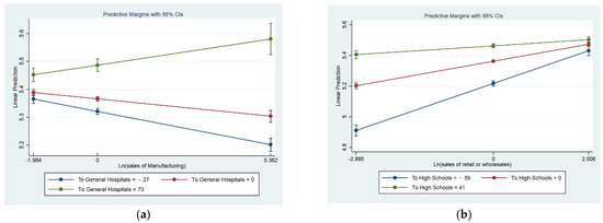 A positive interaction makes the apartment price’s growth steeper at higher accessibility to a target infrastructure as ‘sales’ of the target industry increases. If the distance between upper and lower accessibility lines becomes longer as the x-axis’ value increases, the industry and infrastructure conclude a positive interaction, as shown in Figure 1a. If the distance becomes shorter as the sales increase, we see a negative interaction, as shown in Figure 1b. Figure 1a describes interactions between ‘manufacturing’ and ‘accessibility to general hospitals.’ Figure 1b shows the interaction between ‘retail or wholesale service’ and ‘accessibility to high schools.’