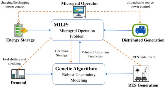 The main parts of microgrids (MG) are renewable energy sources (RESs), which are growing, mainly driven by energy policies and incentives [,,]. For example, a study by the International Energy Agency (IEA) showed that the total installed capacity of RESs in the world will be tripled by 2040, which will produce 41% of the total electricity in the world []. In addition, one of the main benefits of MGs is the capability to work in island mode to serve the local loads [,]. This application is especially helpful in the case of major events. However, the uncertainties mainly imposed by RESs may affect and reduce the performance of MGs []. Therefore, scheduling of MGs in the islanded mode has great importance and must also consider the uncertainties.