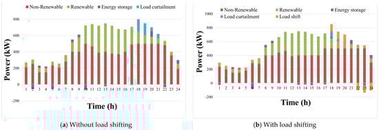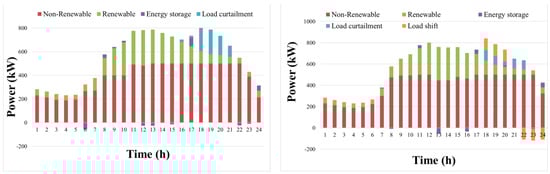 The results of the proposed robust scheduling model (Equations (1)–(27)) are presented in this section. It was assumed that the uncertain parameters could vary from 95% to 105% of their forecasted values. The model was solved using the method described in Section 3. The number of chromosomes, population size, and maximum number of iterations for GA were assumed to be 72, 150, and 100, respectively. Moreover, we considered the maximum iteration as the stopping criterion and the Gaussian function for GA mutation. Table 4 illustrates the results for cases with and without consideration of load shifting, similar to the previous section. Furthermore, Figure 4 presents the hourly production of MG resources for the robust model. According to the results, the costs of scheduling in the worst-case situation are k$ 272 and k$ 174 without and with load shifting, respectively. As can be seen, shifting 110 of load in hours 18, 19, and 20 to hours 22, 23, and 24 decreased the total scheduling cost by about 36%. Moreover, it decreased load curtailment by about 46%.