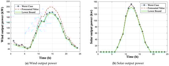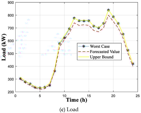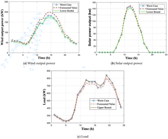 Figure 5 and Figure 6 represent the worst situation of uncertainties for cases with and without considering load shifting, respectively. As can be observed in the figures, the worst situation of wind and solar resources was close to the lower bound most of the time, while it was near the upper bound for the load. The results show that wind outputs had the most distance between the forecasted and worst situation most of the times for both cases. However, the forecast of solar output was more accurate than other uncertainties. The reason is that solar units did not generate energy for at least one-third of a day.