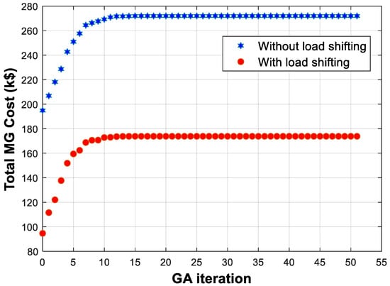 Furthermore, the fitness graph with and without load shifting cases is shown in Figure 7. As can be seen, the proposed model converged in fewer than 15 iterations. Additionally, evolutionary algorithms such as GA may not reach the global optimal solution with one run due to their random starting nature. Therefore, we ran the proposed model several times with a different population size and maximum number of iterations. Table 5 shows the statistical results of running the GA-MILP model with and without load shifting. As can be seen, the standard deviation of running the model was really low, indicating that the utilized GA-MILP method could reach the optimal solution most of the time.