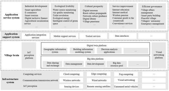 As shown in Figure 1, the digital village technology architecture system constructed in this paper is divided into four levels: infrastructure system, village brain, application support system and application service system. A complete digital village construction needs to include these four levels. The differences in construction in different fields are mainly concentrated in the level of the application service system, while the specific construction content of the other three levels needs to be matched, according to the needs of application development.