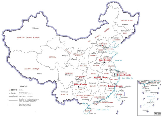 Firstly, in order to ensure that the case areas have good results in the digital village construction, we select case areas from the digital village pilot areas announced by the Chinese governments at all levels. Second, as the digital village construction is a very complex systematic project with a long construction period, and China’s digital village construction is still in its infancy, it is difficult to find the same case with good construction results in different fields. Therefore, this paper adopts the multi-case study method and selects a corresponding digital village case for each of the five fields of rural sustainable development. At the same time, this paper pays attention to the wide range of economic development, topography, transportation and population in the case areas, to make the cases more representative so that the research results can provide reference experiences for more regions to build digital villages. Based on the above case selection principles, this paper selects the digital village construction in Feng County, Wuning County, Taishun County, Xifeng County and Deqing County as the case study objects. This paper has collected more than 260,000 words of original data from papers, news reports, official corporate websites, government reports and other channels, laying a good research foundation for case analysis. The geographical location of each case is shown in Figure 3, and each region is marked with a black dot in the map. Table 1 shows the brief contents of the case study.