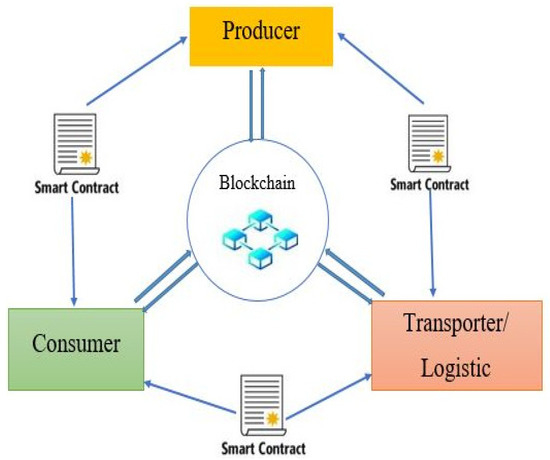 Our system model is discussed in this section. We define the traceable formal model for a food supply chain from farm to fork. The proposed model provides the secure system between different entities of the food supply chain system and uses the blockchain to handles all transaction records of the different events. The supply chain system consists of large entities that carry out the complete process of food manufacture and delivery of food products from farm to end users. That is why it is difficult to trace and track the whole procedure. To achieve the complete traceability, we use the unique identifier for food and record each transaction. To ensure privacy, only the authorized user can access the data and ensure that the authorized user carried out the transactions. In our proposed system, smart contracts are designed to show the interaction of different entities including the producer, transporter/logistics and consumer, as shown in Figure 2. Only registered users perform the specific transaction, and users who are not registered are not allowed to perform any transaction. Different entities are registered and interact by using smart contracts.