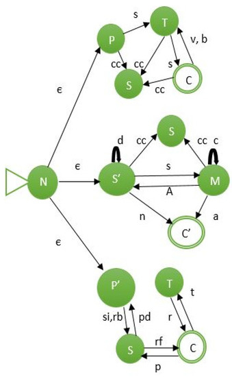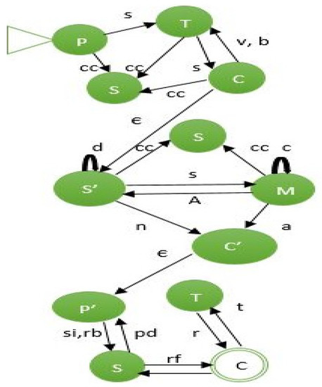 NFA is used to model the food supply chain management system and captures the behavior of the system efficiently. In NFA, the states represent the producer, transporter, consumer and manager, and the edge describes which function is performed. Figure 4 shows the union of three NFAs that represent the flow of food, sensor information and payment process. The states of NFA are {P, T, S, C, M, S’, C’} which represent the producer, transporter, smart contract, consumer, manager, sensor and controller.