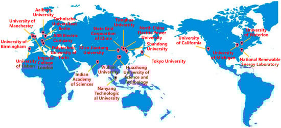 In order to meet the national strategic layout in the field of energy and adapt to the development trends of today’s world, the construction of the Energy Internet on a global scale has become inevitable []. However, the construction and development of the Energy Internet cannot be achieved without the joint efforts of a large number of professionals and technical personnel []. As a new field, the number of technical personnel is extremely limited. Therefore, it has become an urgent task to start educational and scientific research, studying the core technologies necessary for the construction of the Energy Internet, and training the talents needed for the construction of the Energy Internet. At present, many schools and power enterprises around the world have carried out considerable scientific research on smart energy systems. Among them, the number of Chinese organizations that have made achievements is the largest, and the representative ones include the State Grid Corporation of China, North China Electric Power University, Tsinghua University and so on. Many universities in the U.K. have also carried out relevant research, including Imperial College London, the University of Manchester, the University of Birmingham, the University of Liverpool, Cardiff University and so on. Institutions in other countries, such as Technische Universitaet Berlin, Polytechnic University of Turin, Aalborg University, the University of California, the Indian Institute of Science and the University of Lisbon, have also achieved a lot. Some of these universities established the Global Energy Internet University Alliance in 2018, aiming to jointly promote the research and construction of a global Energy Internet. Figure 2 shows the representative organizations of smart energy systems research around the world.