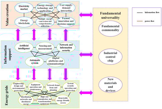 As mentioned in the first section of this paper, the Energy Internet has the nature of multi-disciplinary intersection, so the technology of constructing the Energy Internet involves a wide range of fields []. Based on the current global conceptual consensus on the Energy Internet, the architecture of the standard system of Energy Internet technology can be divided into four layers, namely basic universality, energy grid, information support and value creation []. There is information interaction between every two parts. The basic universality part is the basic support part of the whole technical system, which mainly includes basic commonality, industrial control chips, new materials and devices, etc. []. The main contents of the energy grid include the distribution network and distributed energy, high-end power transmission and transformation equipment, renewable energy friendly access, safe operation and protection of the system, engineering design and environmental protection, equipment operation and maintenance, grid configuration and planning []. In addition to the information interaction between every two parts in the above seven parts, there are also energy and power flows between the distribution network and distributed energy, high-end power transmission and transformation equipment and renewable energy friendly access []. The function of the information support part is mainly to undertake the operation and management of the system, platform and information, including artificial intelligence, sensing and measurement, network and information security, automation system, digital platform and communication. There is information interaction between every two parts []. The final technical dimension is value creation. This level is based on the energy grid level and emphasizes the integration and application of emerging technologies and energy technologies []. The most distinctive feature is the integration and application of the power grid and information technology reflected in smart grid technology. The specific components include the electricity market, energy storage technology and application, user supply and demand interaction, energy blockchain, multi-energy conversion and comprehensive utilization, as well as business model innovation and decision support []. Similarly, there is information interaction between every two of the six parts mentioned above. Figure 4 shows the conceptual model of the Energy Internet technology standard system.