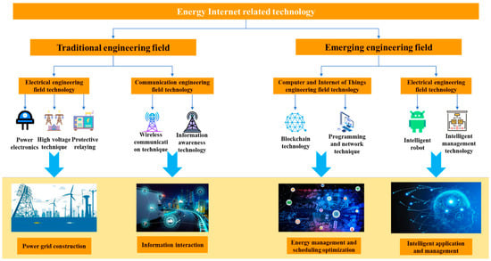 According to the situation reflected by the concept of the Energy Internet technology standard system, the related technology of building the Energy Internet mainly involves the existing technology fields, including electrical engineering, communication engineering, computer and Internet of Things engineering, artificial intelligence and so on []. Related technologies in the field of electrical engineering are still power electronic technology, power system relay protection, power system overvoltage and other technical means applied in the current power grid construction (the main reason is that although the Energy Internet has added many new elements compared with the power grid, energy supply from the traditional power grid is still one of the core energy supplies of the Energy Internet; the traditional grid is still an important part of the Energy Internet) []. Related technologies in the field of communication engineering mainly include information sensing technology [], wireless communication technology and so on (due to the large geographical span of energy deployment, condition monitoring and other problems, information interaction is required; therefore, some important technologies in the field of communication engineering are also essential elements for the construction of the Energy Internet []). The Energy Internet itself has many similarities to the Internet of Things. Both have the essential characteristics of high interconnection of each component element, but the objects are different (the Energy Internet targets all forms of energy, while the Internet of Things targets entities or various electronic products) []. Therefore, blockchain, network technology and programming in the field of computer and Internet of Things engineering are also important technologies for building the Energy Internet []. In particular, blockchain technology can play a key role in sustainable energy systems []. The technology in the field of artificial intelligence determines the upper limit of the development of the Energy Internet []. Applying AI and machine learning techniques to various traditional operational models of the Energy Internet can effectively promote its intelligent transformation. For example, considering the excellent real-time control and robustness of reinforcement learning method, it can be applied to the security and stability control of the power system. Through the design of online and offline control modes, or the design of more intelligent power system security and stability devices based on the algorithm, the control characteristics of the security and stability system can be further optimized. Then, the application of deep learning technology in the Energy Internet can play an important role in load prediction and control of the power grid and energy storage devices, fault diagnosis of power equipment, transient stability assessment of the power system, power big data fusion and anomaly detection and image recognition of power equipment. In addition, deep learning has advantages in feature extraction and model fitting. Considering the actual situation that a large number of new energy power stations, electric vehicles and energy storage devices are connected to the Energy Internet, the application of deep learning will effectively solve the power system problems with high dimensional, complex and coupling relations. The application of intelligent management technology and intelligent robot technology can provide effective help for the inspection and diagnosis of hardware equipment and the optimization of energy transmission and deployment of the Energy Internet. The existence of artificial intelligence technology can not only save human resources in the process of building the Energy Internet, but also complete some tasks that cannot be completed by human resources in the context of a large geographical span []. The related technologies required for the construction of the Energy Internet and their fields are displayed in Figure 5.