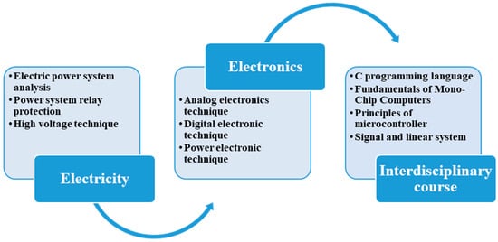 As mentioned above, the knowledge system of constructing the Energy Internet is multi-disciplinary. At the present stage, electrical engineering is a subject with a high degree of interdisciplinary teaching contents, and the interdisciplinary learning contents are mostly related to the core knowledge of building the Energy Internet []. In the early stage of electrical engineering discipline construction, the main contents of teaching were power system analysis, power system relay protection, high-voltage technology and power plant principle as the core contents of electricity. Nowadays, the teaching of electronics content has become non-negligible, and the relevant contents are analog electronic technology, digital electronic technology, power electronic technology and other course contents. One of the characteristics of the knowledge content of the current courses is that it mainly serves the automatic control of power systems and equipment, which is also the technical content required by the hardware facilities of each node of the Energy Internet. In addition, the required course contents of the electrical engineering major in the current stage are no longer limited to the contents of electricity and electronics, but also introduce some core courses of other disciplines with strong universality. The courses include the C language course involving programming (the core course of computer science), the microcontroller principle or MCU principle course involving microcomputer measurement and control (the core content of control engineering discipline) and the signal and linear system course involving information interaction (the core content of communication engineering discipline). Programming, microcomputer measurement and control and information interaction are important pillars of technical support for building the Energy Internet. Figure 7 shows the main teaching contents of the electrical engineering and automation major in the present stage.