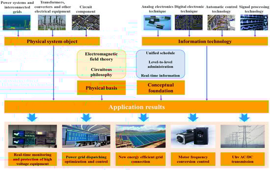 A high degree of information and intelligence is a distinctive feature of the Energy Internet []. It is not a simple process to complete the construction of information and intelligence in conventional physical systems. Since the beginning of the 21st century, researchers around the world have put forward a new concept of a “smart grid” based on the technology in the field of electrical engineering, and it has achieved a certain degree of development up to now. The power system is a highly complex engineering system []. It is of great significance to apply advanced information technology and control technology to the power system, and to transform and upgrade the traditional power system to optimize and improve the efficiency and benefits of power facilities []. This is the concept of the smart grid. With the comprehensive arrival of the digital age and the information age, the trend of industrial system informatization is unstoppable, so the construction of the smart grid has realized the high integration of power system and information technology []. Figure 8 is the schematic diagram of the integration mode of power system and information technology. The application of information technology to power system planning and design, scheduling optimization, control and protection, as well as detection and maintenance, is the same as the concept of the Energy Internet []. Similarly, the Energy Internet also integrates the hardware facilities of physical systems with information technology, and finally realizes information interaction, scientific scheduling and interconnection of multi-energy systems []. Figure 9 is a schematic diagram of the integration mode of energy and information technology in the Energy Internet. Therefore, part of the construction of the smart grid can be regarded as the prelude to the construction of the Energy Internet, which is another advantage of building the Energy Internet based on the contents of the electrical engineering field. The construction of the Energy Internet can be realized more quickly and conveniently by referring to the concept and experience of building the smart power grid and organically combining part of the technical achievements with new technical means [].