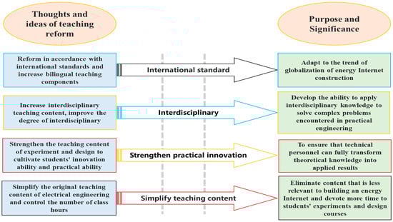 In addition, the talents needed for Energy Internet construction are applied engineering talents []. At the present stage, the construction of the Energy Internet is still in its infancy [], and the technology is facing constant innovation. Therefore, higher requirements are put forward for the recruited talents’ innovative ability and practical ability. In order to cultivate talents with good innovative ability and practical ability, courses related to design and exploration should be strengthened in the process of teaching reform, and the amount of class hours and assessment standards of these course should be increased appropriately, so as to ensure that students have creative thinking and practical ability to solve problems. The contents shown in Figure 10 reflect our thoughts and ideas on teaching reform.