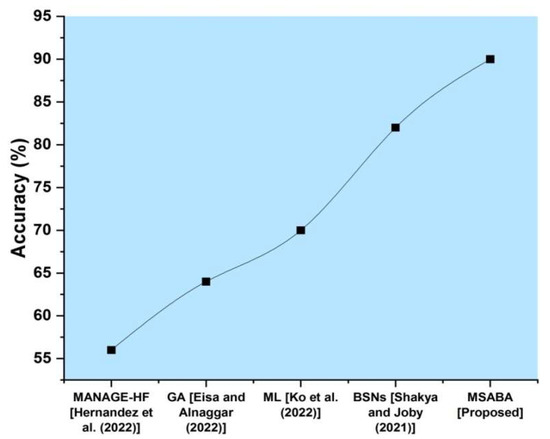 The proximity among measurements and their “real” values are referred to as accuracy. A measurement’s accuracy decreases with distance from the expected or true value. The degree to which evaluation results of a proportion are much closer to the actual value of that number indicates more accuracy of the device. The accuracy of the suggested approach and existing approaches are displayed in Figure 4. The proposed approach is demonstrated to be more accurate when contrasted with the existing method. The accuracy of the proposed algorithm and the existing systems’ estimations of heart disease are highlighted. While MANAGE-HF has a 56% accuracy rate, GA has a 64% accuracy rate, ML has a 70% accuracy rate, and BSNs have an 82% accuracy rate, the suggested method (MSABA) has a 90% accuracy rate. It demonstrates that the suggested strategy is more successful than the existing approaches.