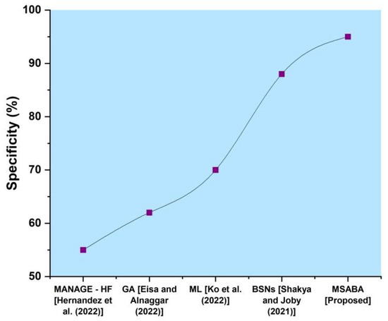The accuracy of a test at identifying people who do not have a condition or feature is known as specificity. It is the percentage of people who are accurately diagnosed as actually not at risk or without a condition (such as a trait, disease, categorization, or label) by a diagnostic tool. Figure 8 demonstrates the specificity of both existing and new proposed methodologies. According to Figure 8, the suggested system of MSABA achieves 95% specificity, compared to MANAGE-HF 55%, GA 62%, ML 70%, and BSNs 88%. It indicates that the suggested system is more valuable than the existing approaches.